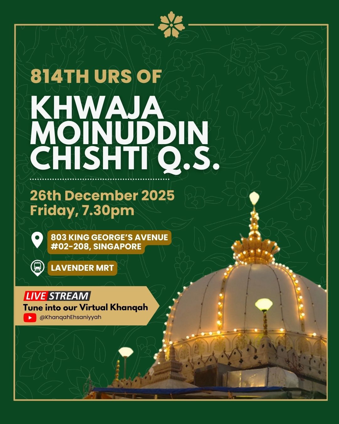 Khanqah Ehsaniyyah invites you to the 814th Urs of Khwaja Moinuddin Chishti رَحْمَةُ اللهِ عَلَيْهِ – Sultanul Hind, the radiant auliya whose life reshaped the spiritual landscape of Hind.